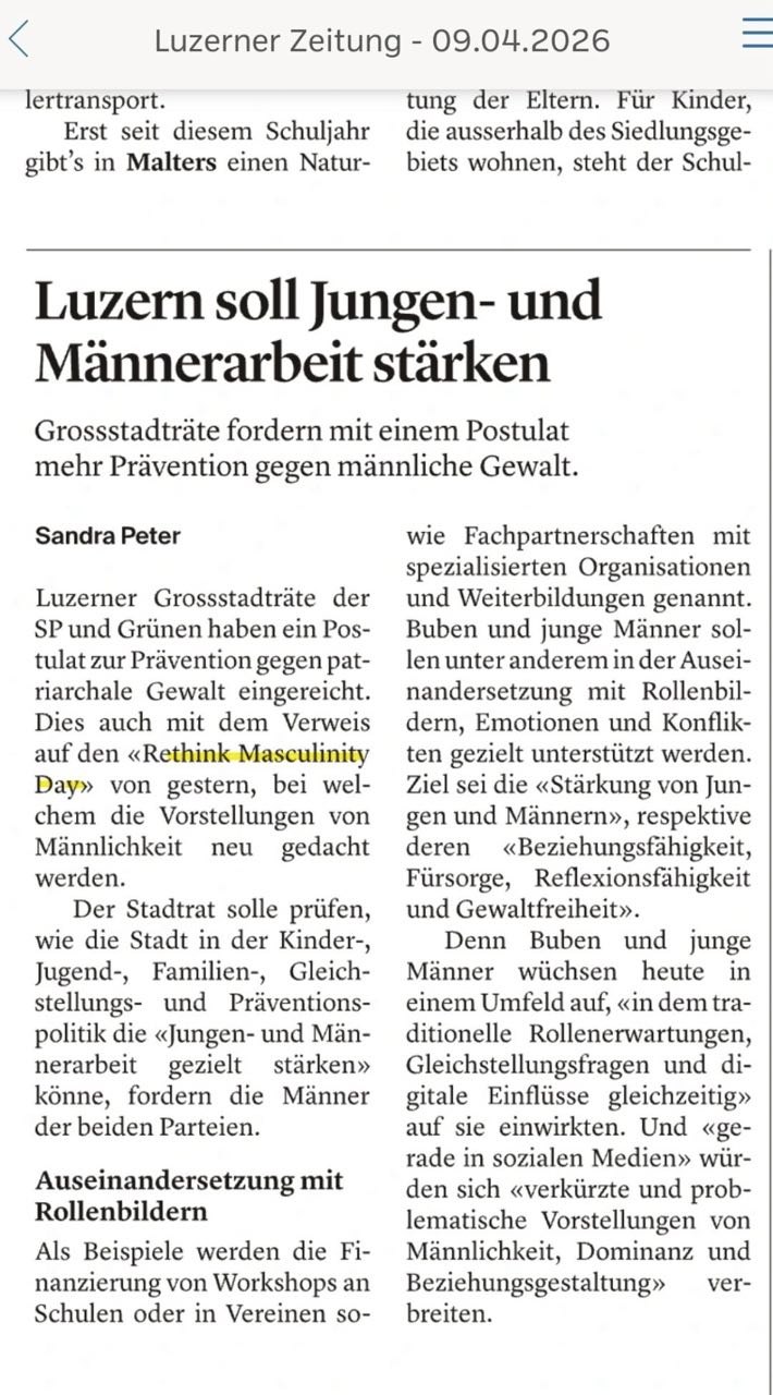 Nachfolgend eine Zusammenstellung von Medienartikeln, Videobeiträgen und Podcasts, in denen unser Verein oder der Rethink Masculinity Day vertreten war. Es gibt auch einen Medienspiegel spezifisch zum Rethink Masculinity Day.